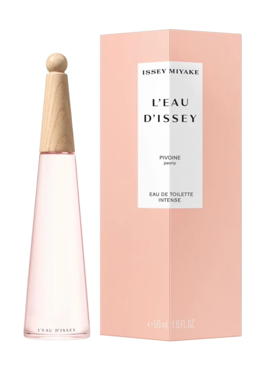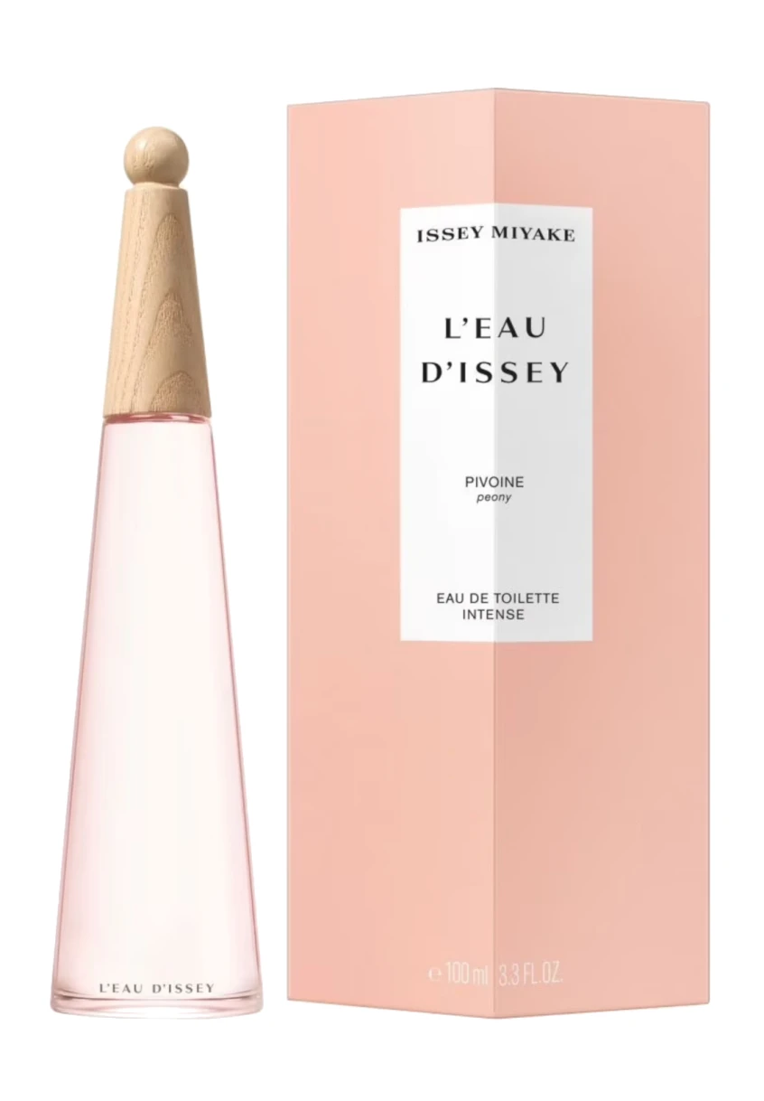Le flacon de L’Eau d’Issey Pivoine Eau de toilette Intense contient 20% de verre recyclé PCR et son capot est composé intégralement de bois naturel, sans plastique.