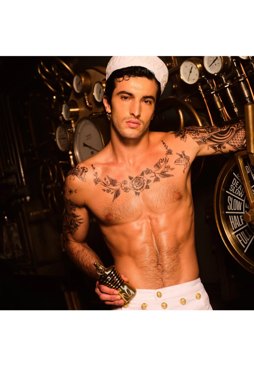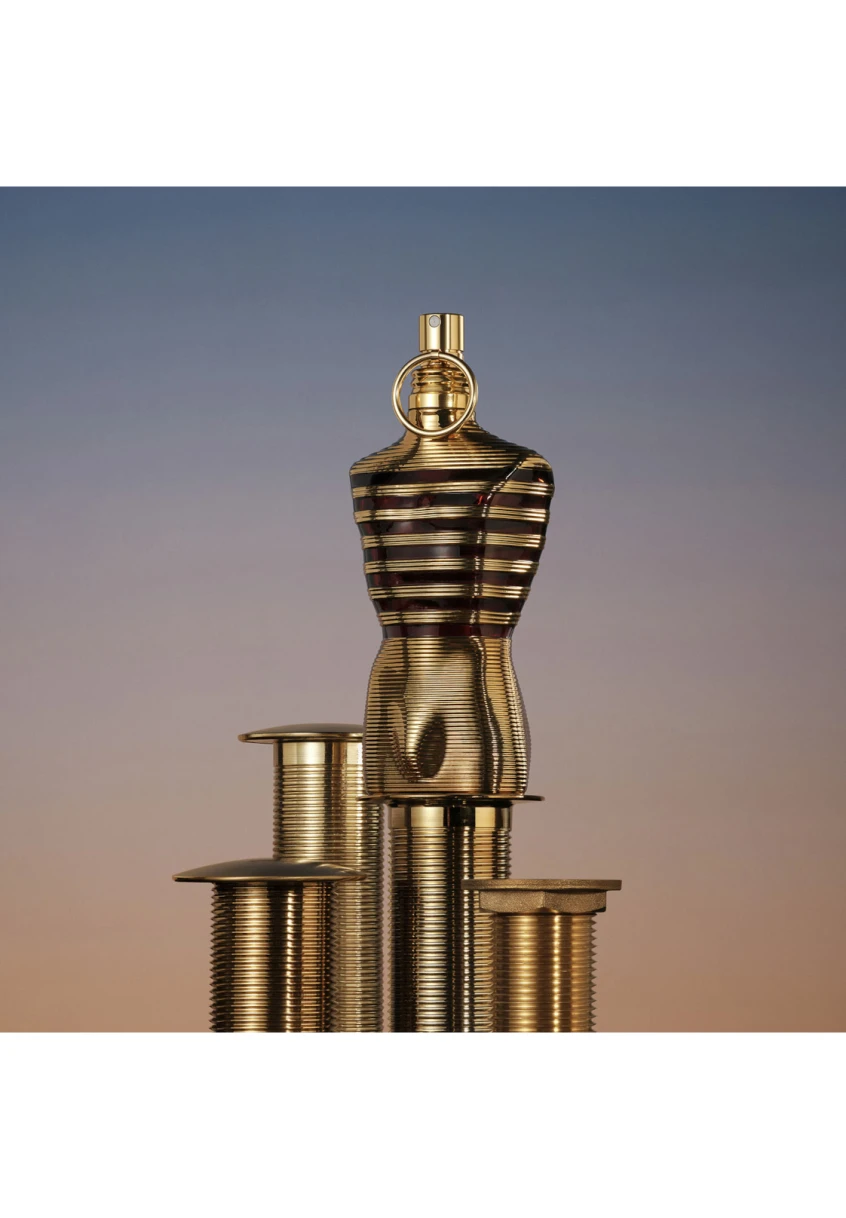 Quelle chaleur de plomb ! Sur votre sillage, l’or coule à flots ! Contenu dans son flacon emblématique de buste d’homme, ce parfum éclatant s’habille d’une marinière brun translucide. Capturé dans son coffret métallique assorti, le flacon est si torride que l’or fond en stries flamboyantes sur son torse musclé.