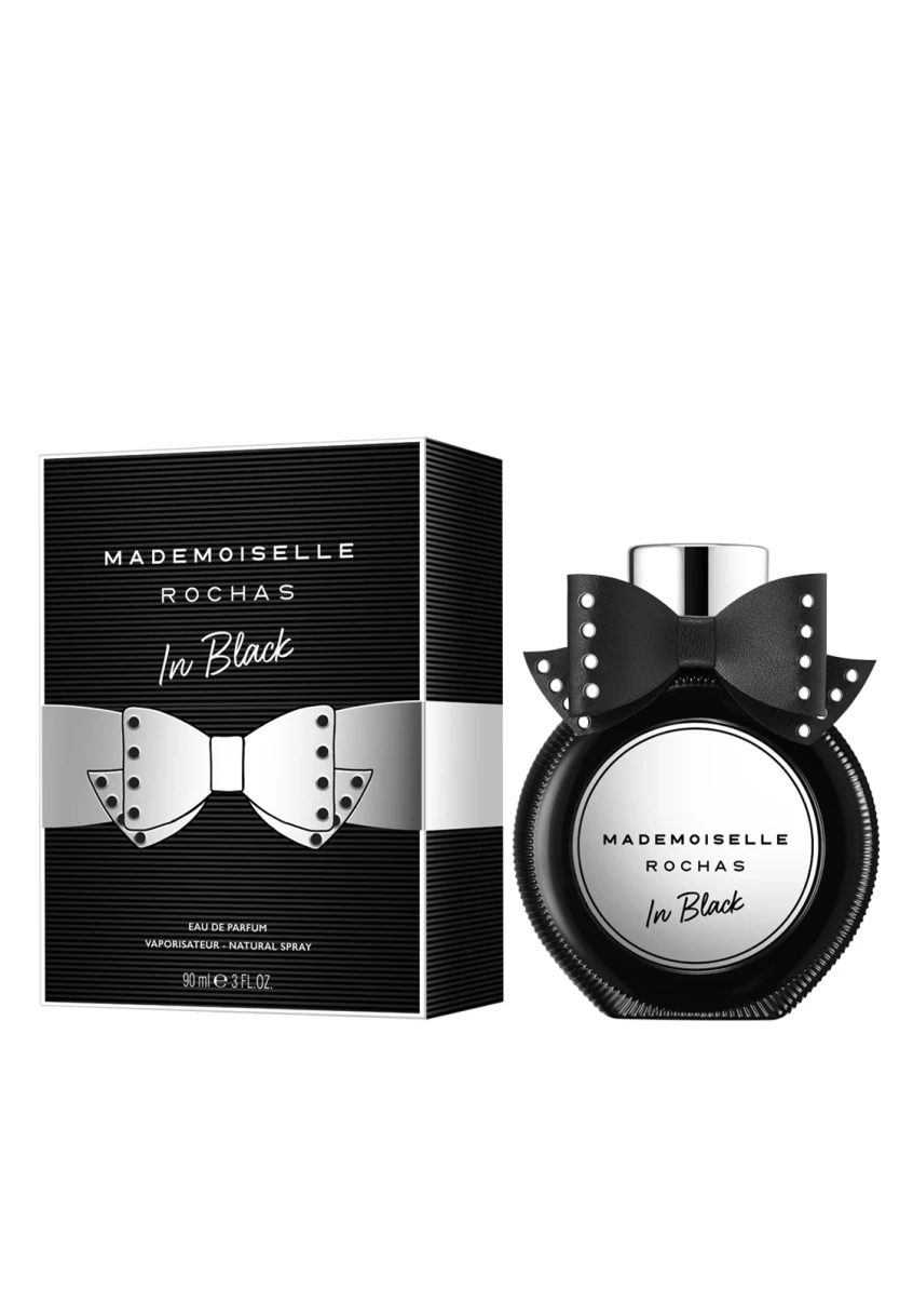 Pour ce nouvel opus, elle adopte un total look noir et nous fait découvrir une nouvelle facette de sa personnalité. Résolument rock et terriblement chic, le flacon de Mademoiselle Rochas In Black se pare d’un noir profond et d’un nœud en cuir lisse mat à clous. A la fois féminin et rebelle, ce nœud est la signature de son look.
