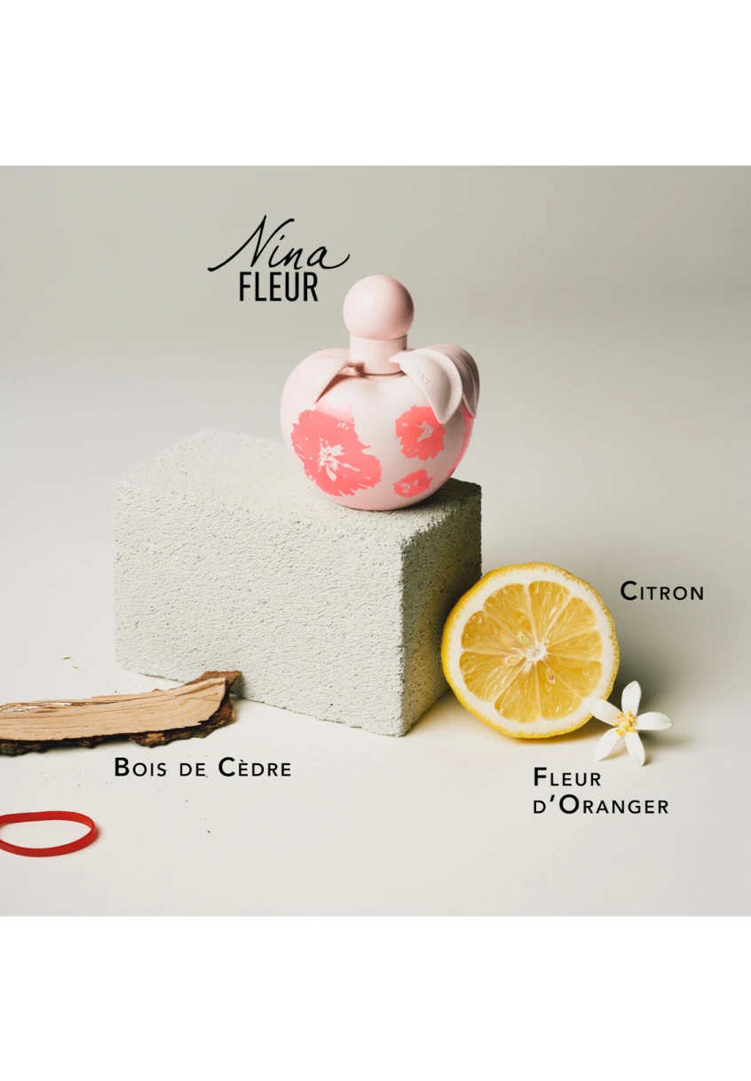 Capturée dans son célèbre flacon de parfum en forme de pomme d’amour habillé d’un imprimé floral, faisant écho aux motifs des collections couture, Nina Fleur est un véritable accessoire de mode.